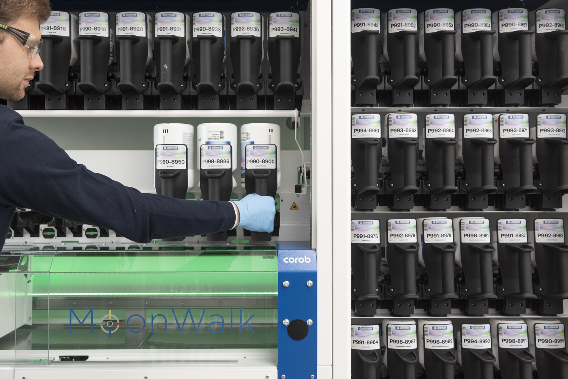 - Die Wage fährt auf dem Schlitten unter jede Dosiereinheit und aktiviert damit die Pumpe